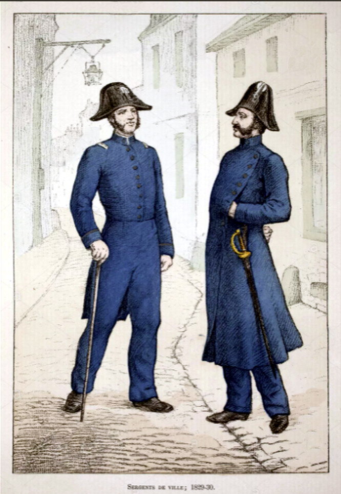 Полицейских сержантов было вдвое больше (90 полицейских), чем инспекторов, вдобавок для них была изготовлена форменная одежда – фраки или рединготы синего сукна с пуговицами, украшенными гербом города, а также треугольные шляпы. Днем полицейские сержанты имели при себе трость с белой рукоятью, а для ночных обходов вооружались шпагой, которую носили на черной портупее. Набирали их из числа бывших военных ростом не ниже «5 футов 3 дюймов» (162 см). Скептики опасались, что вольнолюбивые парижане, привыкшие враждовать с полицией, примут их в штыки, однако полицейские сержанты не вызвали у горожан враждебности – возможно, именно потому, что носили мундиры. Любопытно, что лондонские констебли облачились в темно-синие мундиры только в 1829 году.